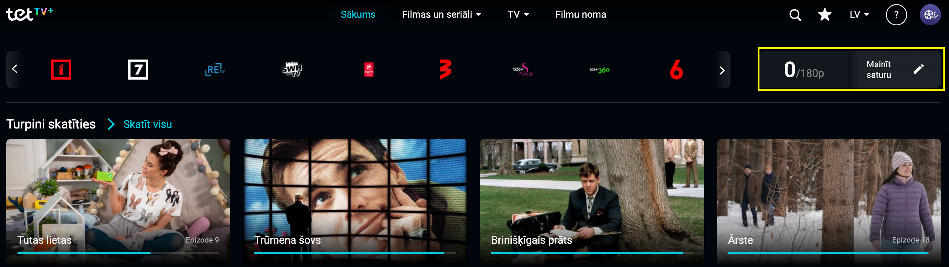- Pēc autorizēšanās, sākuma lapas augšējā labajā stūrī redzēsi sava abonementa ietvaros pieejamo un izmantoto punktu skaitu, kā arī pogu Mainīt saturu.