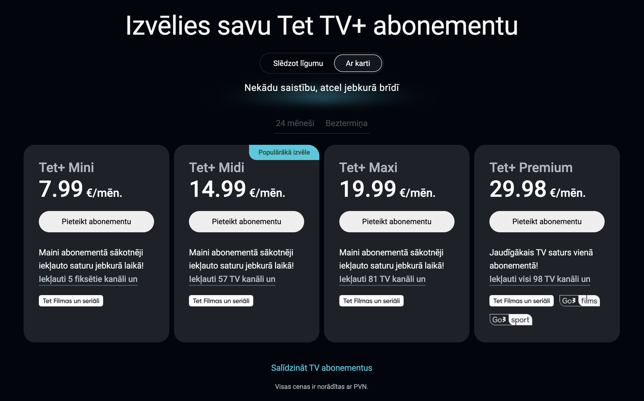 1. Dodies uz tet.plus/onboarding/select-subscription, lapas augšpusē spied uz pogas "Ar karti' un izvēlies vēlamo abonementu.