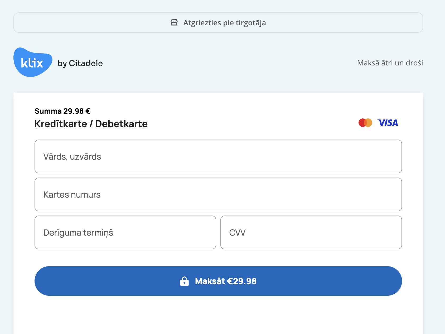 3. Nākamajā - noslēguma solī - pārlūkā atvērsies lapa, kurā būs nepieciešams ievadīt maksājuma kartes datus, lai uzsāktu abonementu.
