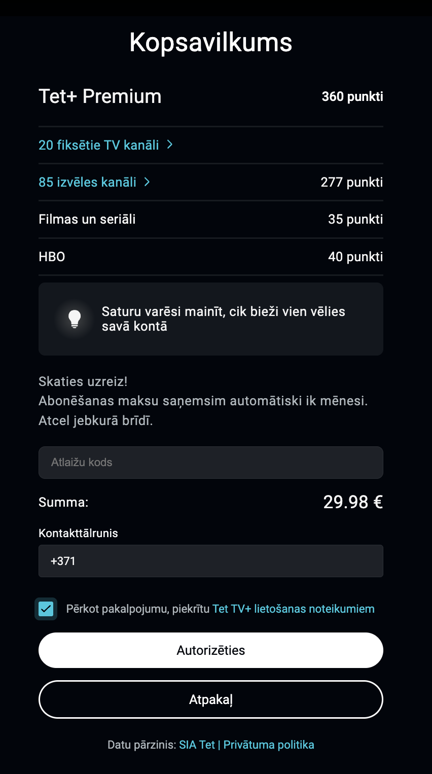 2. Nākamajā solī redzēsi izvēlētā abonementa kopsavilkumu. Pirms turpināt, dod piekrišanu Tet+ lietošanas noteikumiem un spied pogu Autorizēties.