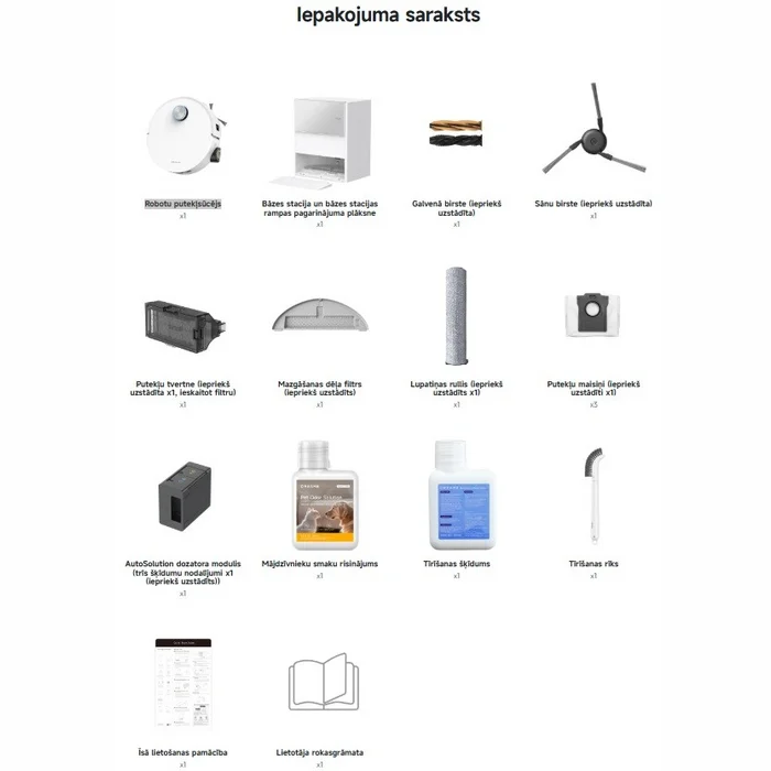 Automātiskās šķīdumu padeves modulis (ar trīskāršo tīrīšanas līdzekļu tvertni, jau uzstādīts, 1 gab.) x1, Mazgāšanas sistēmas filtrs (jau uzstādīts) x1, Putekļu tvertne (jau uzstādīta, 1 gab., ar filtru) x1, Sānu birste (jau uzstādīta) x1, Galvenā birste (jau uzstādīta) x1, Bāzes stacija un rampas pagarinājuma plāksne, Robots putekļsūcējs, Rullveida mops - 1 gab., Tīrīšanas līdzeklis mājdzīvnieku smaku neitralizēšanai x1, Putekļu maisiņš x 3, Tīrīšanas šķīdums, Tīrīšanas birste, Dokumentācija