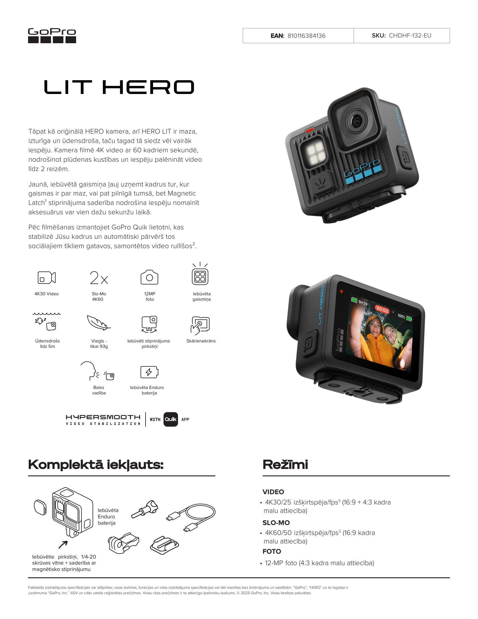 Komplektā ietilpst: LIT HERO kamera, izliekts līmējošs stiprinājums, īkšķskrūve, gaismas difuzors, stiprinājuma sprādze, USB-C kabelis.