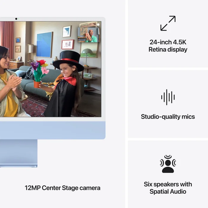 iMac. Mūsdienīgākais “viss vienā” galddators. Ar M4 čipa superjaudu lido gan internets, gan darbi vairākās aplikācijās vienlaicīgi. Ar iespaidīgu 24 collu 4,5K Retina displeju,1 ikonisku dizainu un mūsdienīgu kameru, mikrofoniem un skaļruņiem iMac ir lielisks gan darbos, gan izklaidē.
